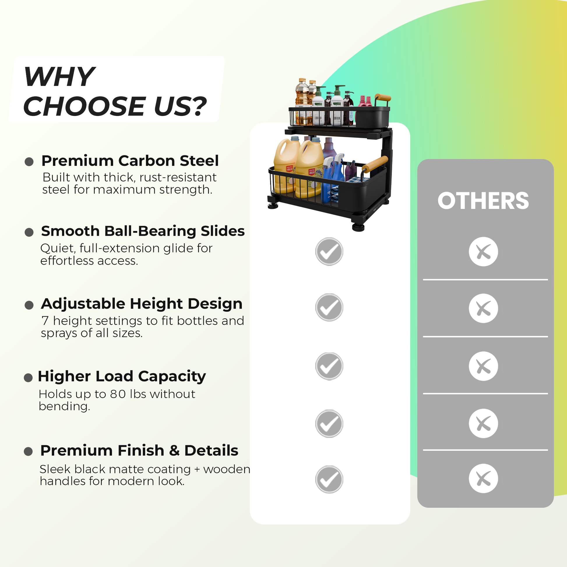Customize your storage space with a 7 adjustable height feature, perfect for any cabinet size.